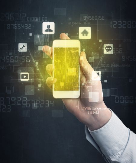 Caucasian hand in business suit holding a smartphone with golden-yellow holographic screen