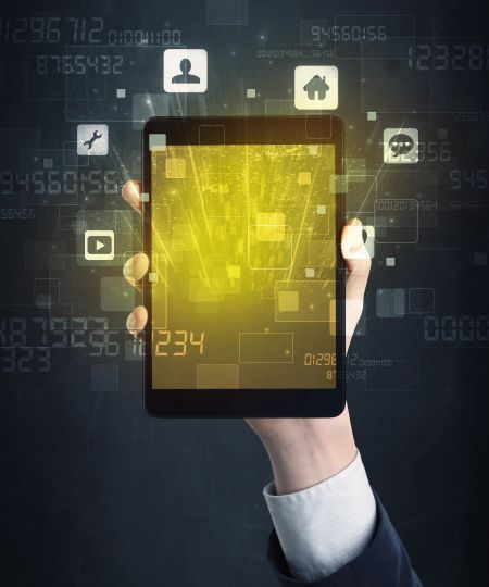 Caucasian hand in business suit holding a smartphone with golden-yellow holographic screen