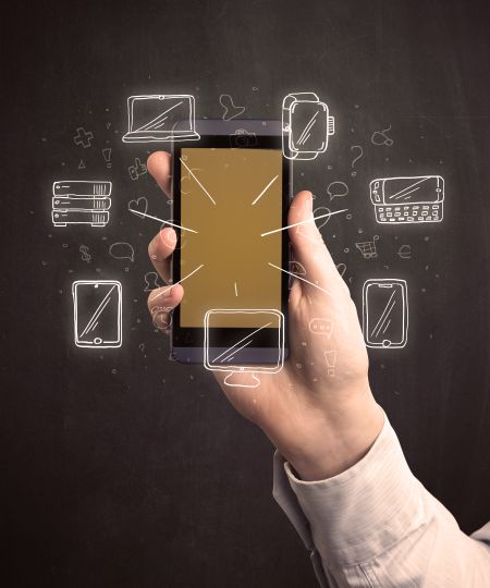 Caucasian hand in business suit holding a smartphone with hand-drawn icons