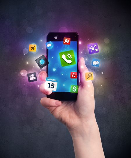 Caucasian hand in business suit holding a smartphone with colorful media icons