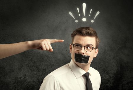 Caucasian hand pointing at employee in business suit, with drawn exclamation marks above his head
