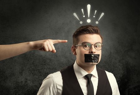 Caucasian hand pointing at employee in business suit, with drawn exclamation marks above his head