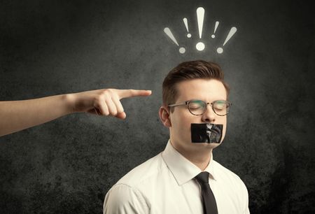 Caucasian hand pointing at employee in business suit, with drawn exclamation marks above his head