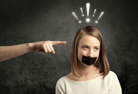 Caucasian hand pointing at female employee with drawn exclamation marks above her head