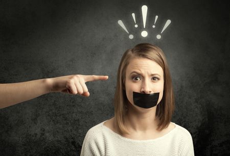 Caucasian hand pointing at female employee with drawn exclamation marks above her head
