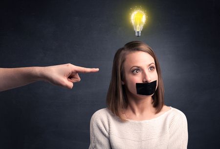Caucasian hand pointing at female employee with a lightbulb above her head