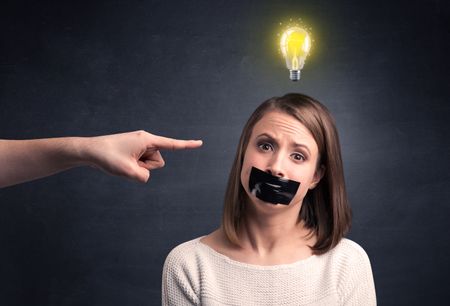 Caucasian hand pointing at female employee with a lightbulb above her head