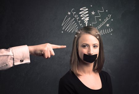 Caucasian hand pointing at scared female employee