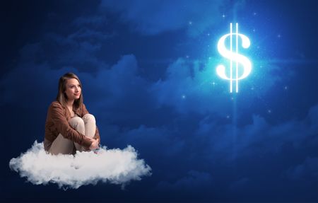 Caucasian woman sitting ona white fluffy cloud daydreaming of money