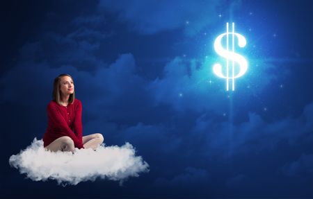 Caucasian woman sitting ona white fluffy cloud daydreaming of money