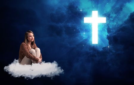 Caucasian woman sitting on a white fluffy cloud looking at a big, bright; blue; glowing cross
