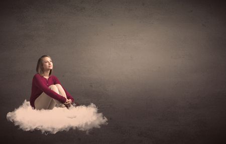 Caucasian woman sitting on a white fluffy cloud daydreaming beside a plain grunge background