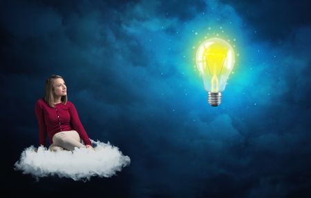Caucasian woman sitting on a white fluffy cloud looking and wondering at a big, bright, shiny, glowing yellow lightbulb