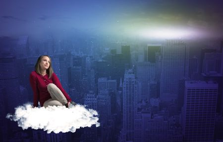 Caucasian woman sitting on a white fluffy cloud above the big city wondering