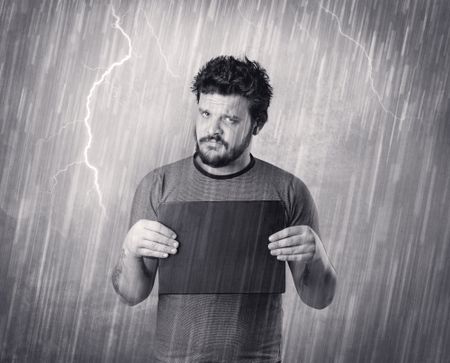 Caught gangster with rainy, grey background and black table on his hand.