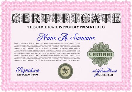 Certificate or diploma template. Cordial design. Easy to print. Customizable, Easy to edit and change colors. Pink color.