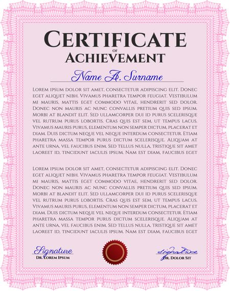 Certificate or diploma template. Customizable, Easy to edit and change colors. Easy to print. Cordial design. Pink color.