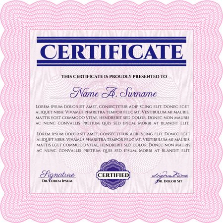 Certificatem diplmoa or award template. Design template. Money style design. With guilloche pattern. Pink color.