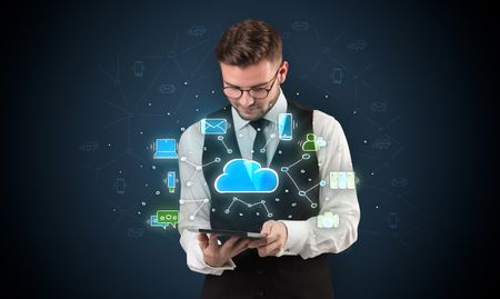 Chalk drawn cloud technology symbols on a tabled handled by businessman