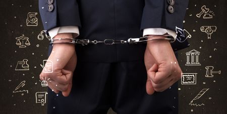 Chalk drawn courthouse symbols and close handcuffed hands in suit