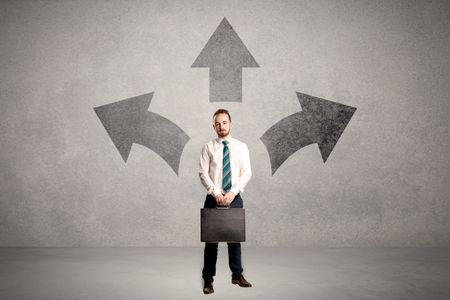 Charming businessman in doubt, choosing from three directions in front of a grey wall