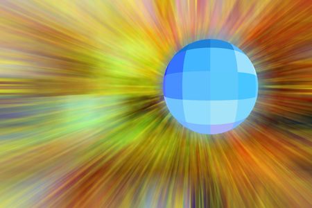 Checkered blue and blue-green planet hurtling toward an unseen source of universal radial blur as if traveling faster than light