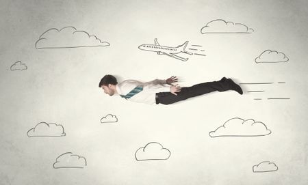 Cheerful business person flying between hand drawn sky clouds concept on background