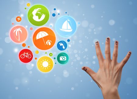 Cheerful happy smiling fingers with colorful holiday travel bubble icons