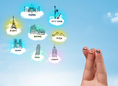 Cheerful happy smiling fingers with sightseeing landmarks icons
