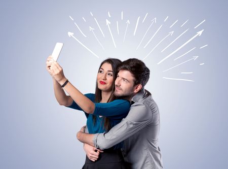 A cheerful young couple taking selfie photo with mobile phone and white lines and arrows pointing to the sky above them concept
