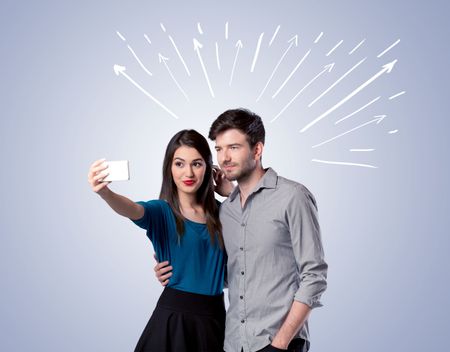 A cheerful young couple taking selfie photo with mobile phone and white lines and arrows pointing to the sky above them concept