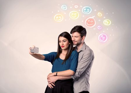A cheerful young couple taking selfie photo with mobile phone and colorful happy smiley faces illustration above them concept