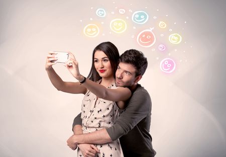 A cheerful young couple taking selfie photo with mobile phone and colorful happy smiley faces illustration above them concept