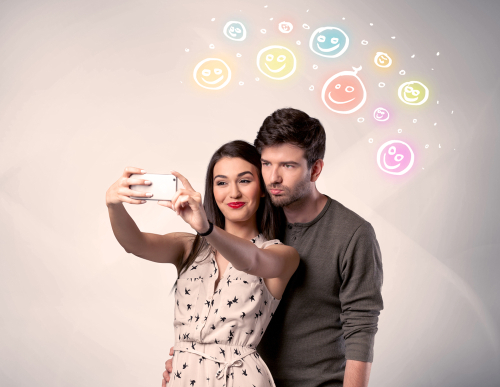 A cheerful young couple taking selfie photo with mobile phone and colorful happy smiley faces illustration above them concept