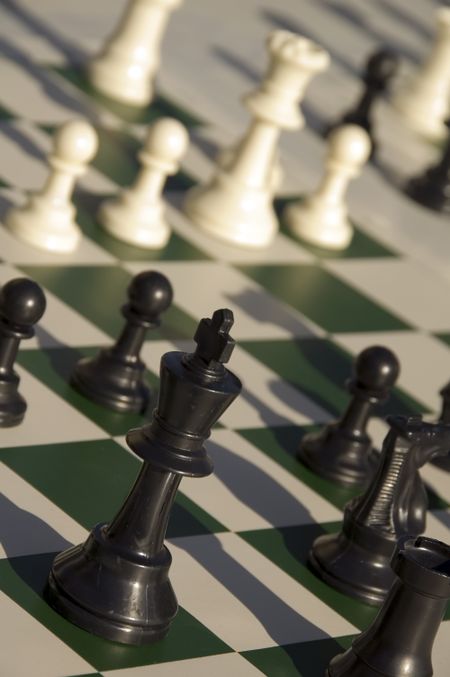 Chess game in progress -- black king and minions standing near white queen and hers (focus on black king)