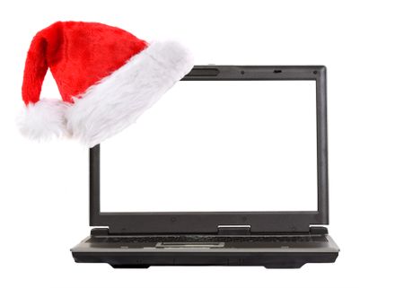 christmas laptop with a hat on the screen over white