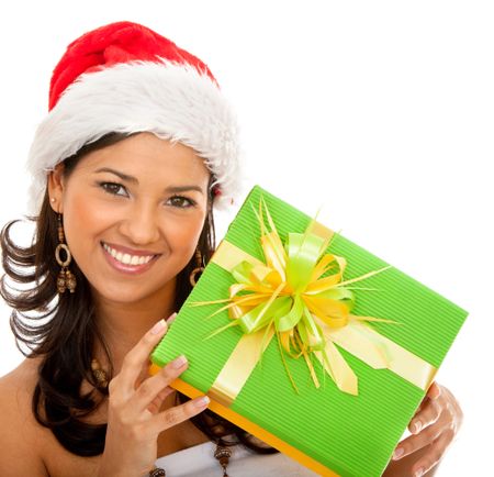 Christmas woman with a gift isolated over a white background