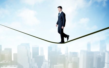 City scape, tall buildings and clouds on clear blue sky with business person balancing on black rope concept