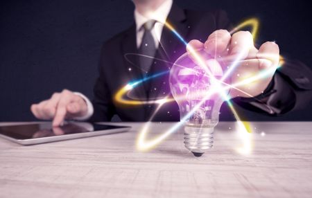 A classy businessman holding a colorful light bulb with shining circles in front of dark background concept.