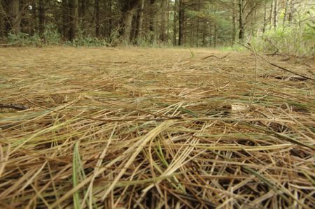 Clearing in woods strewn with pine needles (focus on middle ground)