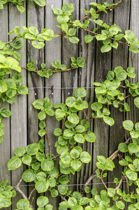 Climbing hydrangea (binomial name: Hydrangea anomala ssp. petiolaris 'Mirranda'), with raindrops, trained in spring garden. This subspecies of vine is native to China, South Korea, Japan, and Siberia.