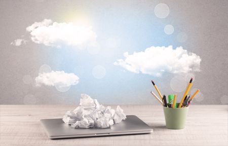 Close up of business office desk concept with clouds, blue sky and sunshine