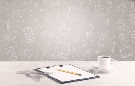 Close up of business office desk with laptop tablet in front of brown wall background full of drawn communication icons and school items concept