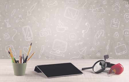 Close up of business office desk with laptop tablet in front of brown wall background full of drawn communication icons and school items concept