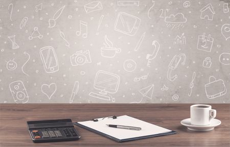 Close up of business office desk with laptop tablet in front of brown wall background full of drawn communication icons and school items concept