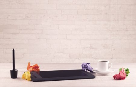 Close up of business office desk with pen board coffee in front of empty white brick textured wall background.