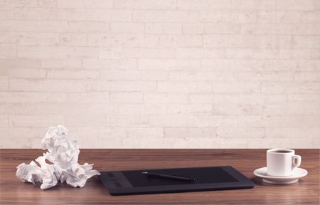 Close up of business office desk with pen board coffee in front of empty white brick textured wall background.