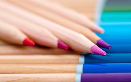 Close up of color pencils organized in a box