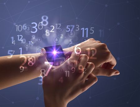 Close up female naked hand wearing smartwatch and numbers around