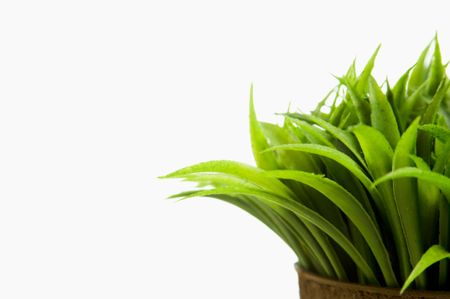 close up of green grass coming out of small pot.